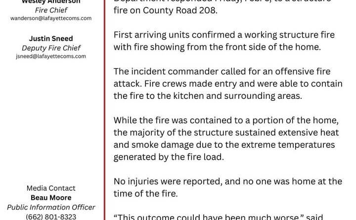 Lafayette County Fire Department responded Friday to a structure fire on County Road 208, according to a news release from the department.