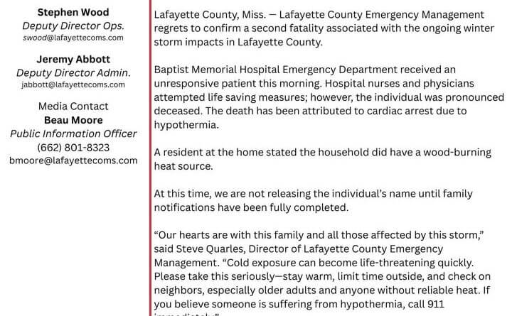 LAFAYETTE COUNTY, Miss. — Lafayette County Emergency Management has confirmed a second death related to the ongoing winter storm in the area.