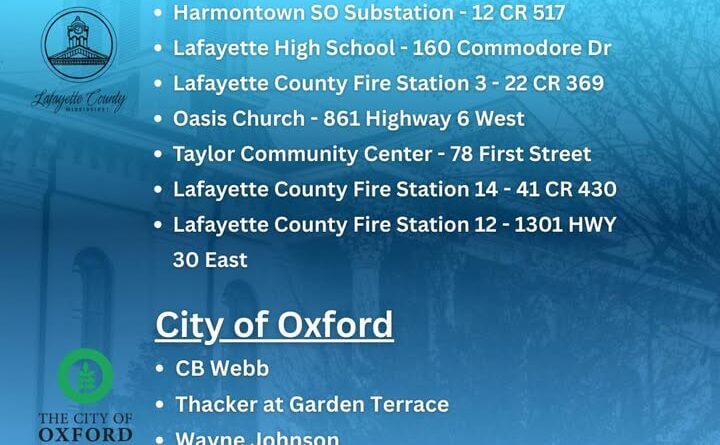 In the city of Oxford, distribution points are located at CB Webb, Wayne Johnson Thacker at Garden Terrace, and other designated sites. The Mississippi National Guard is staffing these locations to assist with distribution efforts.
