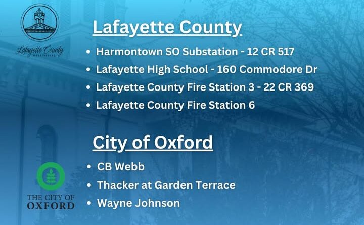 In Lafayette County, residents can visit the Harmontown Sheriff’s Office Substation at 12 CR 517, Lafayette High School at 160 Commodore Drive, Lafayette County Fire Station 3 at 22 CR 369, or Lafayette County Fire Station 6. In Oxford, distribution points include CB Webb, Thacker at Garden Terrace, and Wayne Johnson.