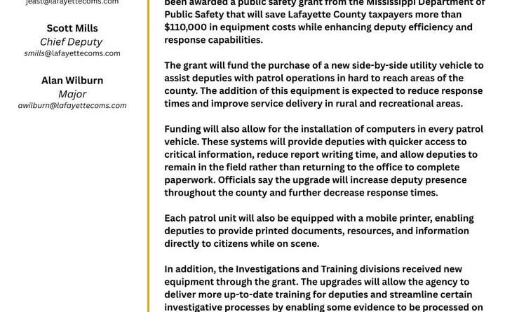 The Lafayette County Sheriff’s Office has received a public safety grant from the Mississippi Department of Public Safety, officials announced Tuesday. The funding will save Lafayette County taxpayers more than $110,000 in equipment costs and enhance deputy operations.