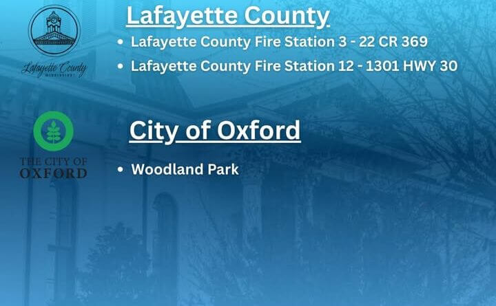 Lafayette County will distribute meals ready-to-eat and water on Feb. 6 starting at noon. Distribution sites include Lafayette County Fire Station 3 at 22 County Road 369 and Fire Station 12 at 1301 Highway 30, according to county officials.