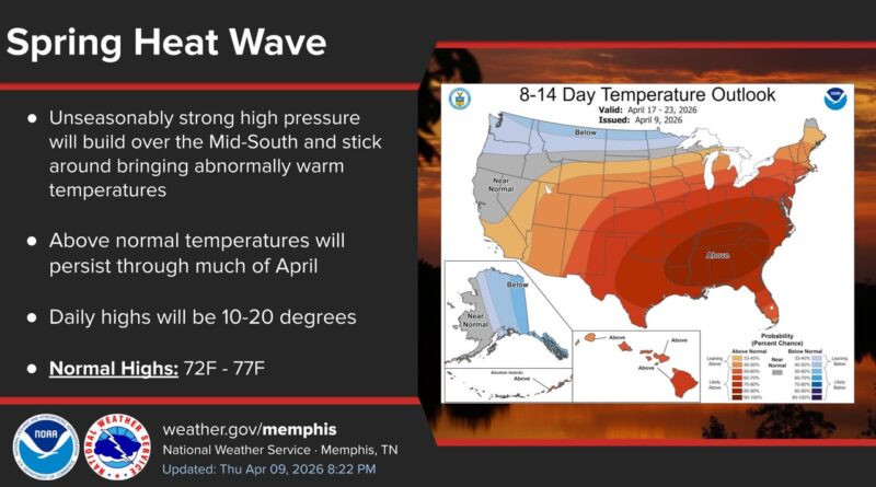 The National Weather Service Memphis and NOAA’s Climate Prediction Center are warning residents of an upcoming early heat wave and ongoing drought conditions across the Mid-South. An unseasonably strong high-pressure system is settling over the region, leading to daily highs potentially 10 to 20 degrees above normal, with temperatures reaching the upper 80s to mid-90s, according to NOAA.