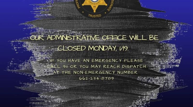 The office will be closed on Jan. 19, according to a notice from the department. Despite the closure, deputies will continue to be out and available to assist the public, the department said.