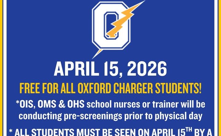 Oxford Charger students can participate in free sports physicals scheduled for April 15, according to school officials. The event is open to all Oxford Charger students, including those at OIS, OMS, and OHS.