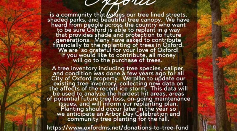 Officials encourage community members to donate to the city’s tree fund, which supports planting new trees in public areas. Donations can be made online at oxfordms.net.