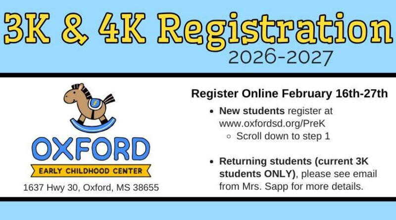 Oxford School District is accepting registrations for its 3K and 4K programs for the 2026-2027 school year. The registration period runs from February 16 through February 27.
