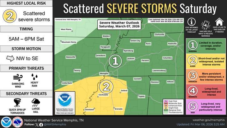 Lafayette County and the city of Oxford are under a level 2 of 5 risk for severe weather on Wednesday, according to the National Weather Service. The area faces potential impacts from a large storm system, including damaging winds, heavy rainfall, and the possibility of brief tornadoes, the agency said.