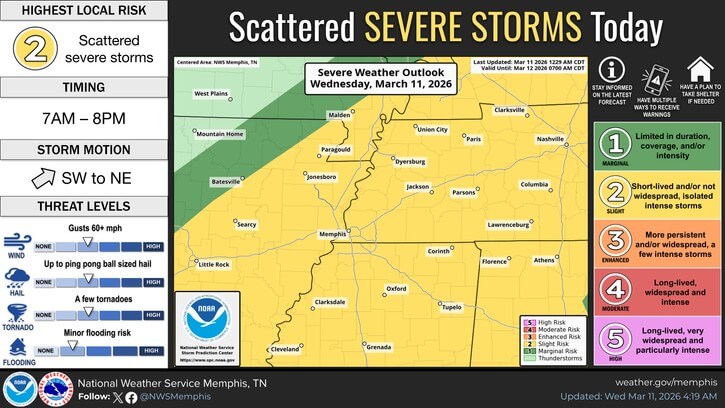 The agency forecasts storms increasing after early afternoon, with gusty south winds and periods of heavy rain. The primary concern is damaging winds, with potential secondary threats including large hail, brief tornadoes, and localized flash flooding.