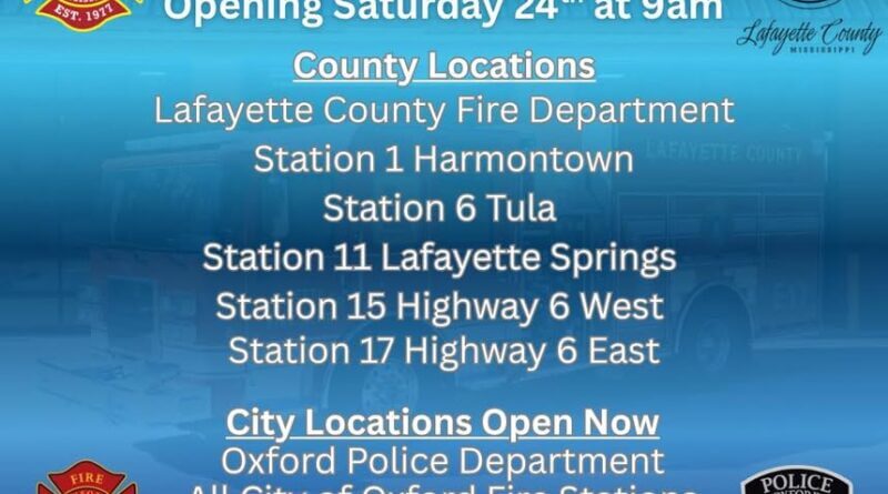 Lafayette County’s warming centers will open Saturday at 9 a.m. and will remain available for those in need. Locations in Oxford include the Oxford Police Department at 9 Industrial Park Drive and four fire department stations at 399 McElroy Drive, 399 F.D. ‘Buddy’ East Parkway, 139 Highway 7 South, and 200 Mall Drive.