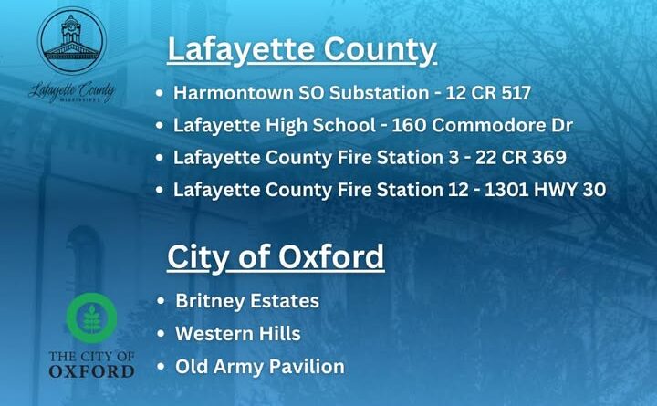 In Lafayette County, distribution sites include the Harmontown SO Substation at 12 CR 517, Lafayette High School at 160 Commodore Drive, Lafayette County Fire Station 3 at 22 CR 369, and Lafayette County Fire Station 12 at 1301 Highway 30.