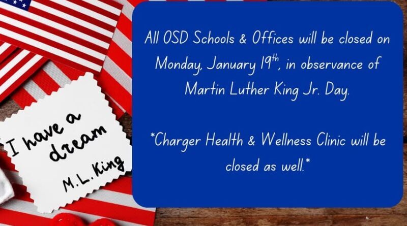 All Osd schools and offices will be closed Monday, Jan. 19, in observance of Martin Luther King Jr. Day, according to district officials.